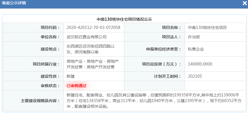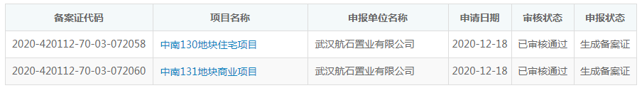 在拿地不足一個(gè)月后,2020年12月18日,武漢航石置業(yè)有限公司中南130地塊住宅項(xiàng)目、中南131地塊商業(yè)項(xiàng)目接連申報(bào)備案,根據(jù)備案信息顯示,住宅投資約14億,商業(yè)投資約7億,均將于2021年5月動(dòng)工。